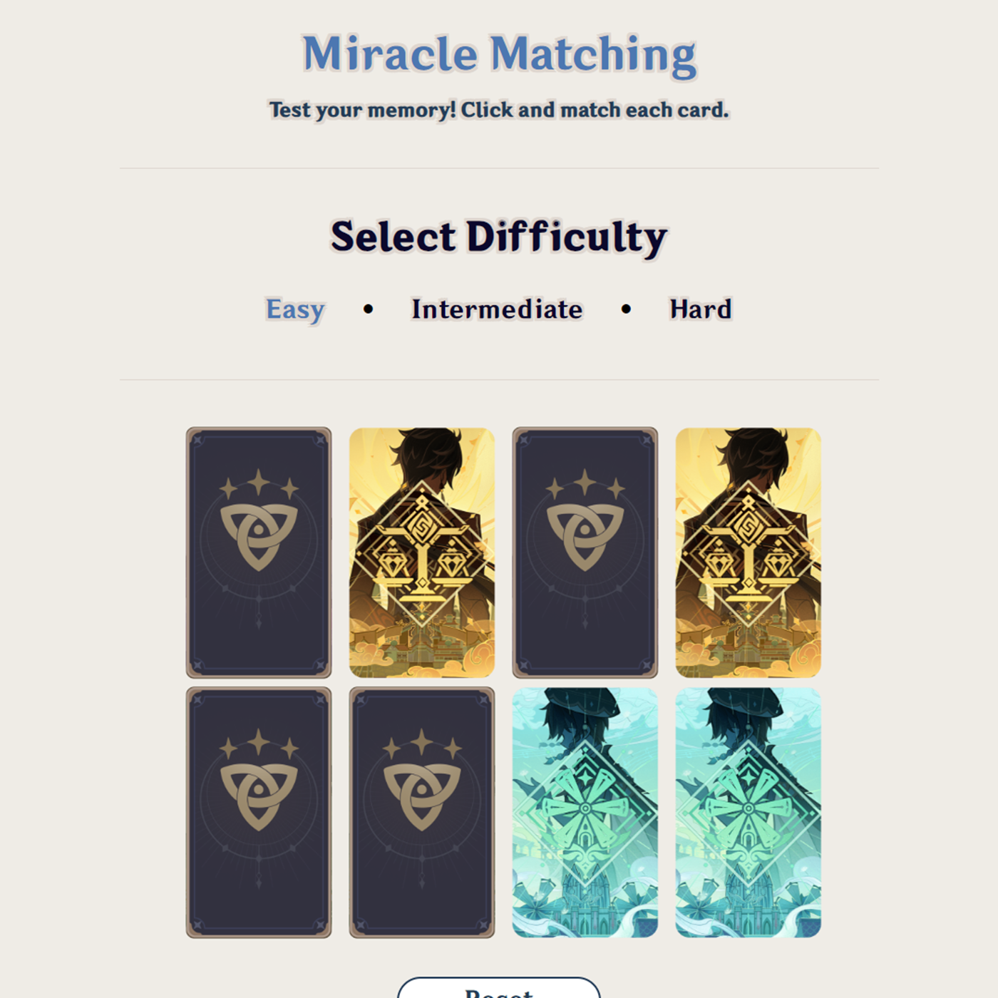 Card matching game programmed using vanilla JavaScript. Contains 3 difficulty levels.